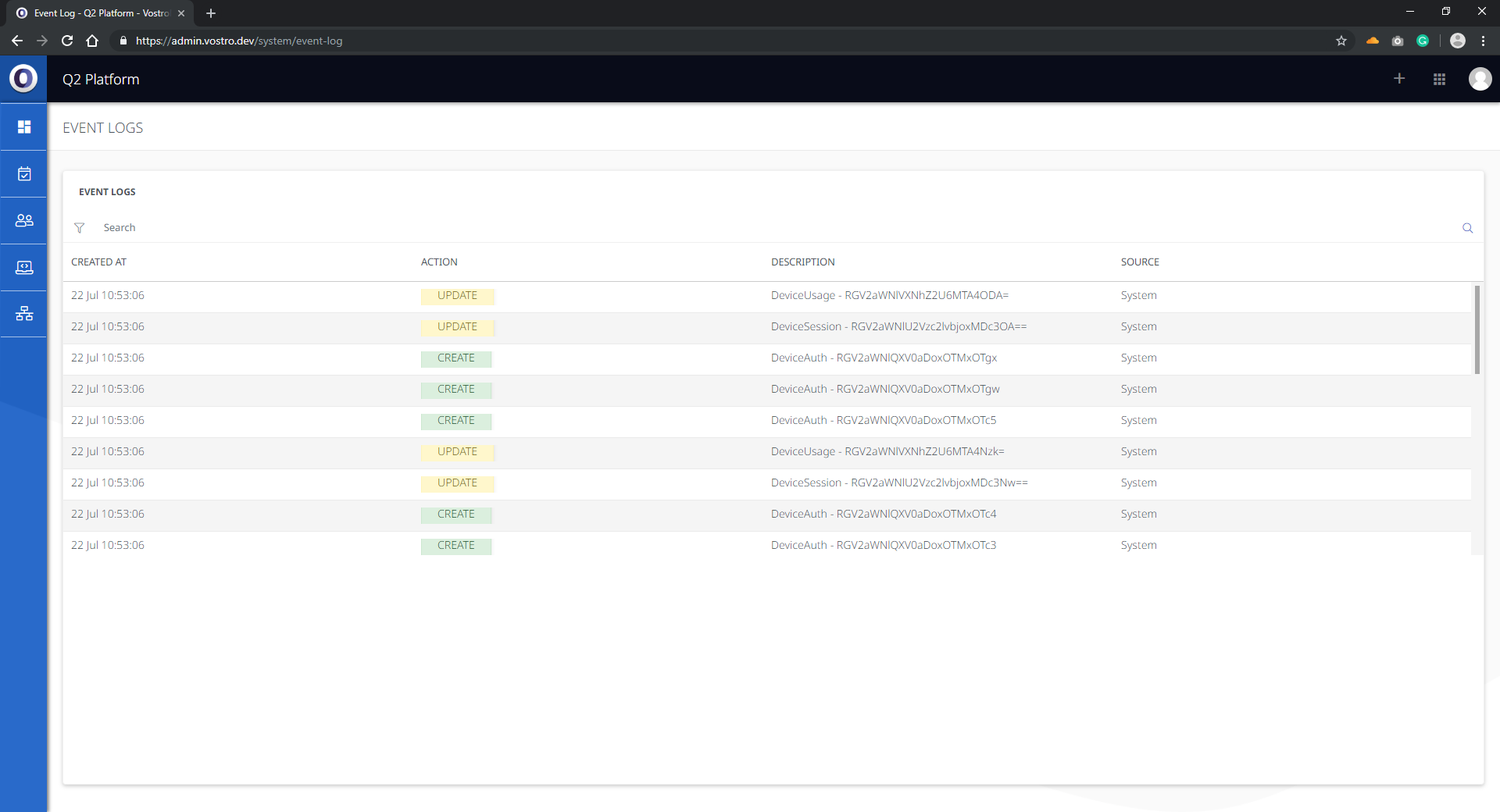 Event Logs provide important diagnostic information for both administrators and VostroNet support. The event logs record every action on the platform.